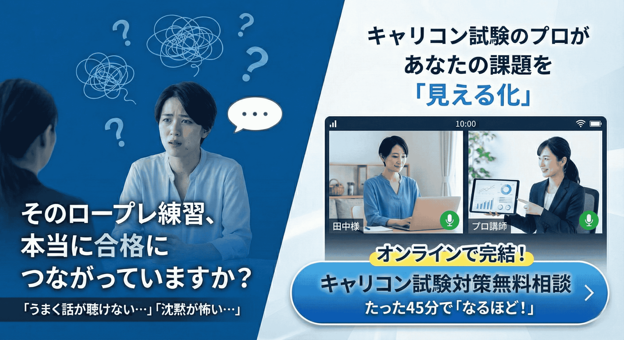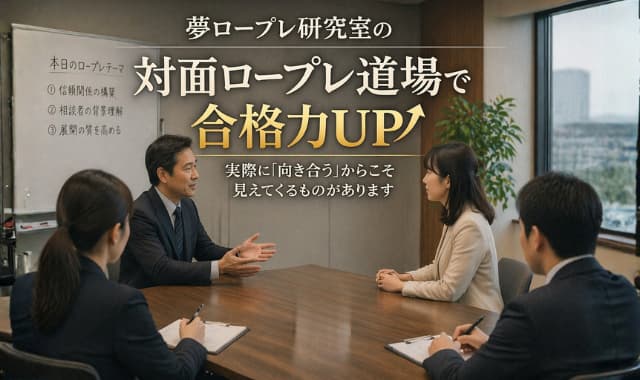 少人数グループ形式の実践練習。自分が相談者役を行うだけでなく、他者のロープレを「観察」することで客観的な視点を養います。本番に近い緊張感の中で練習したい方に最適です。