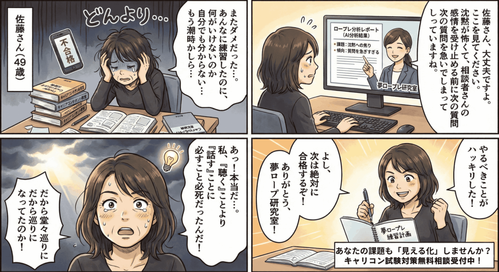 キャリコンのロープレ試験。「うまく話が聴けない…」「沈黙が怖くて焦ってしまう…」 そんなあなたの悩み、たった45分で「なるほど、そういうことか!」に変わるかもしれません。