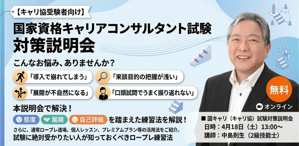 少人数グループ形式の実践練習。自分が相談者役を行うだけでなく、他者のロープレを「観察」することで客観的な視点を養います。本番に近い緊張感の中で練習したい方に最適です。